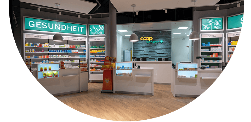 Die Coop Vitality Apotheke bietet Ihnen ein umfassendes Sortiment an Pflegeprodukten, Gesundheitsartikeln und Medikamenten, und dies auch am Wochenende oder nachts dank des Notfallschalters im Untergeschoss.